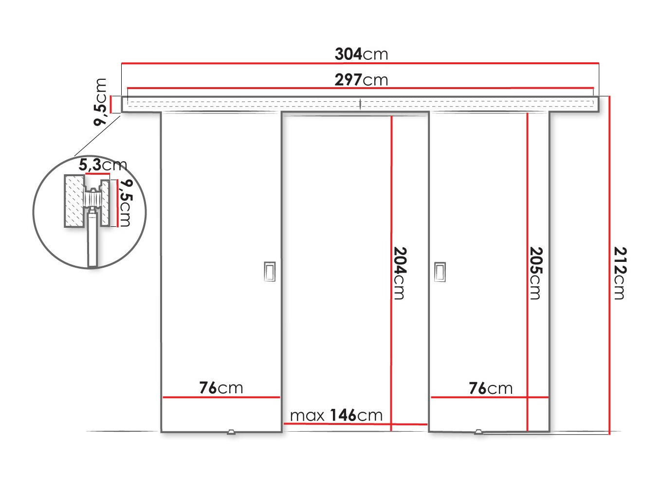 Skydedørssystemets dimensioner: