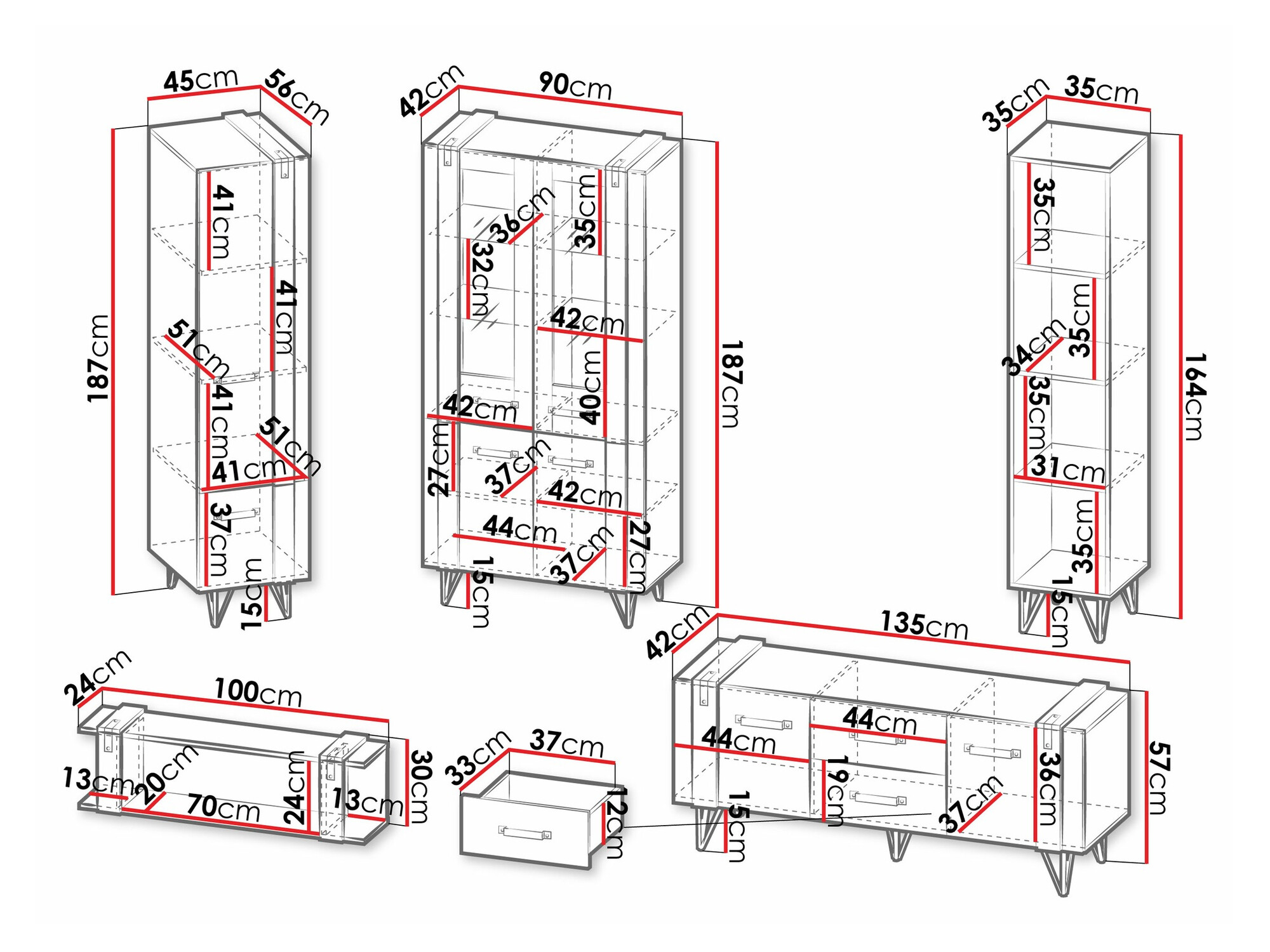 187 x 45 x 56; 187 x 90 x 42; 164 x 35 x 35 cm