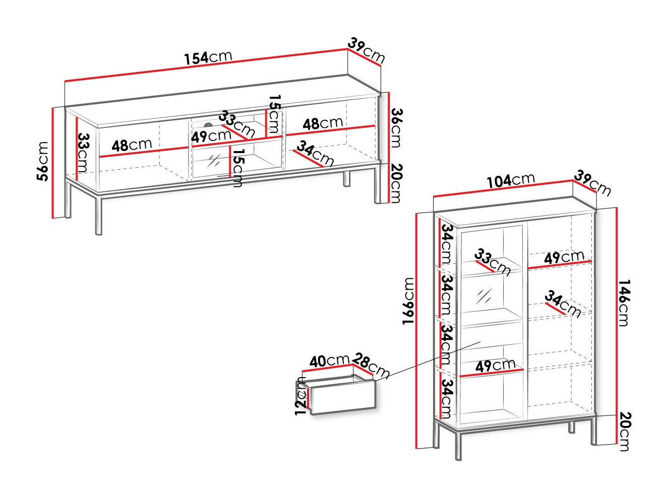 Møblerne er pæne og praktiske. Jeg havde et problem med at installere skubbemekanismerne til at åbne dørene på tv-skabet. Hullerne, der blev boret til dem, markeret på vejledningen, var 1 cm dybe ind i huset, og to af dørene ville ikke åbne.